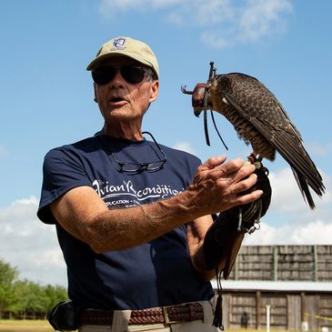 Scott is a Master Falconer. He has practiced falconry since he was 14 years old and began working professionally as a falconer in the 1990s. He specialized in abatement and trained birds for shows. Now, Scott uses falconry to rehabilitate birds of prey with his wife Carol and leads flight demonstrations at the Avian Reconditioning Center.
